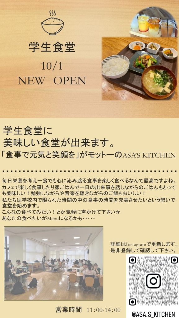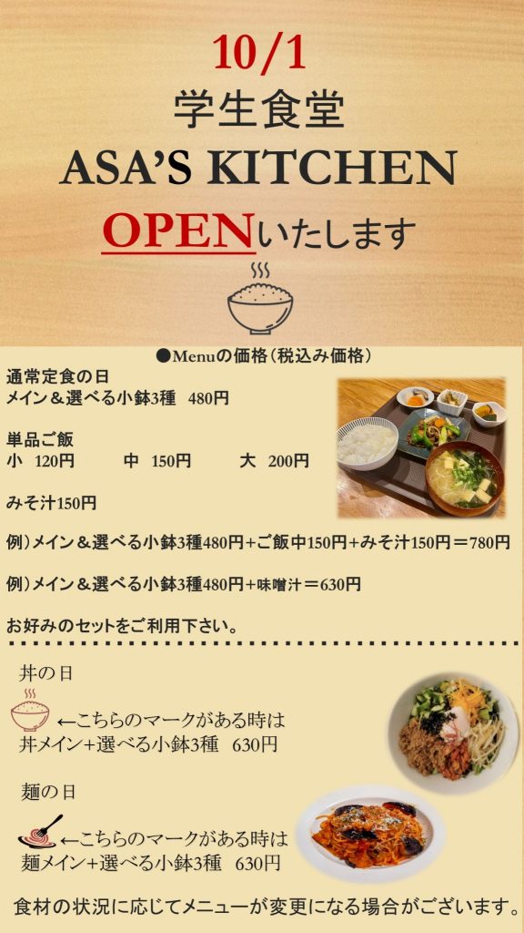 香川県立保健医療大学内食堂として「 ASA’S KITCHEN 」が、10月1日にOPENしました。